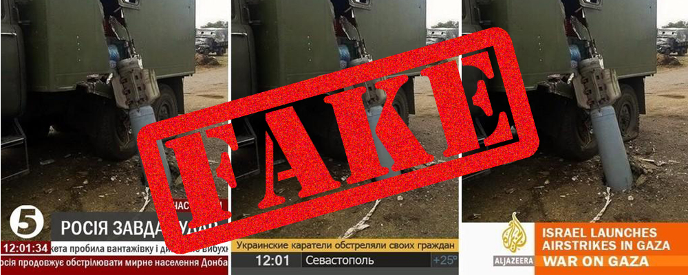 Heute Vormittag habe ich ein Bild auf Twitter geteilt, welches vermeintlich die Krisenherde in der Ukraine – aus russischer und ukrainischer Sicht – aber auch den Konflikt im Gazastreifen zeigen soll. Das Brisante daran: Es ist dreimal derselbe Bildinhalt sichtbar, aber jeweils in einer anderen Senderumgebung (ukrainisches Fernsehen, Россия und Al Jazeera).
