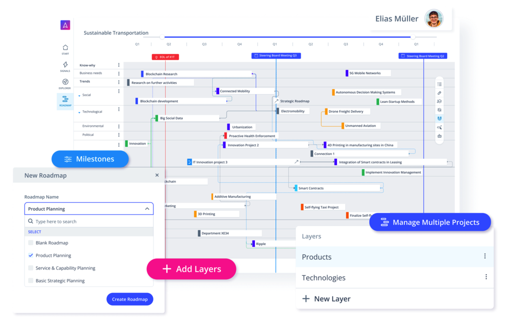 Itonics hilft bei der Erstellung eines Trend- und Technologie-Radars, der Erfassung von Ideen, Ableitung von Chancen und Erstellung von Portfolios und Roadmaps. Foresight reiht sich dabei als ein methodisches Element von mehreren im strategischen Innovationsprozess auf dieser Plattform ein.
