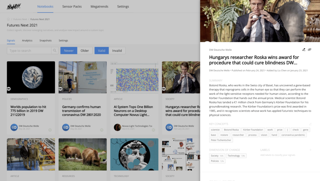 Newness bietet Strategie-, Innovations-, Forschungs- und Marketingteams die Möglichkeit, kollaborativ Daten und Signale zu sammeln. Dadurch können im Team Veränderungen sichtbar und kontextualisiert, aufkommende Probleme identifiziert, tiefergreifende Analysen durchgeführt und neue Szenarien entwickelt werden.
